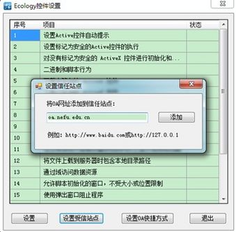 按钮,点击控件设置进行下载控件;将插件下载至本地电脑并进行解压安装,建议右键选择以管理员身份运行;点击设置进行一键设置、设置受信站点,输入OA系统网址oa.nefu.edu.cn,重新启动浏览器。
