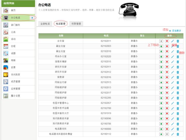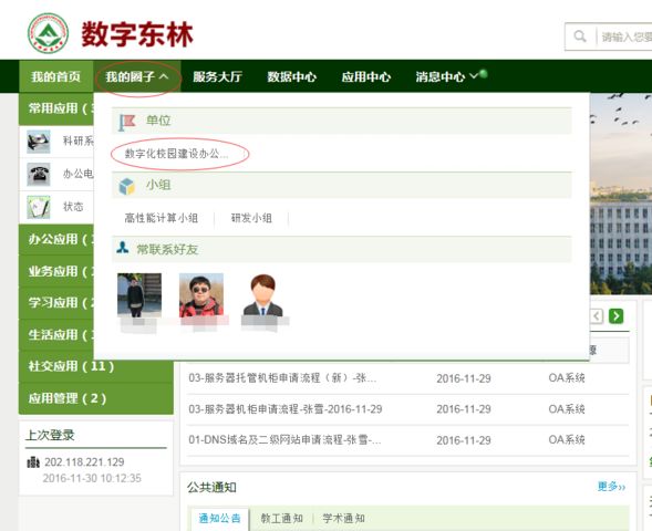 校园办公电话是我校师生员工沟通交流及对外服务的主要方式,数建办依据各单位提交学校办公室的电话号码对校园办公电话进行了更新。校园网主页的校园电话数据来源于数字东林平台圈子的办公电话,请各单位信息员登录数字东林,进入圈子核实办公电话号码。如有办公电话号码变动由各单位信息员自行维护。操作如下: