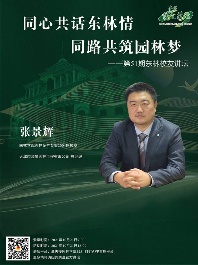 张景辉校友将结合学专业、做专业的自身工作生活经历,深情讲述他多年奋战在园林专业的心路历程和收获感悟。