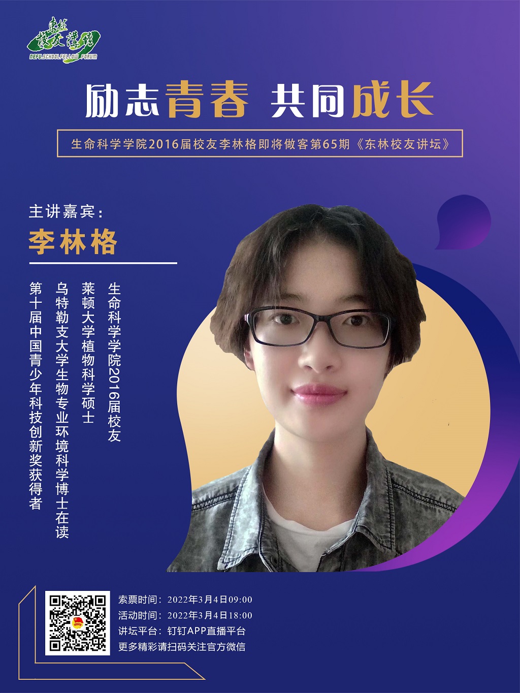 参与方式:通过关注“东林团委”官方微信平台(nefutw)进行抢票。凭“抢票成功”凭证方可加入钉钉群参与活动。