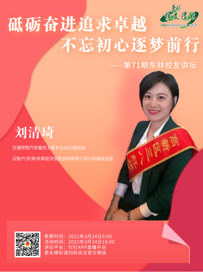 她是怀揣东林梦想的优秀校友,她是努力逐梦前行的青年榜样,届时,刘清琦校友将用她的成长经历,为我们讲述她的工作和生活的收获感悟。欢迎广大师生届时参加!