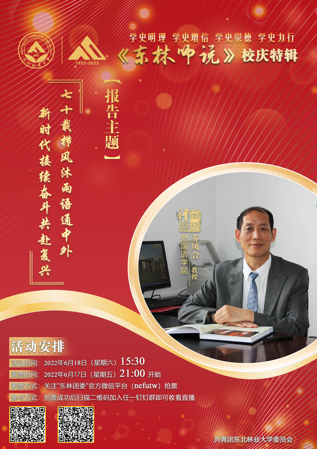 乔凤合教授将结合自身经历,回顾在学校70年发展历程中,外国语学院建设“开放式、行业化、国际化”学院的发展历程,详细介绍学院在学科建设、学术科研、学生工作、专业社团等方面取得的丰硕成果,引领青年学生更全面地了解东林人70年筚路蓝缕、砥砺奋进的辉煌历程,以此为激励共同书写东林、外国语学院的奋斗故事。