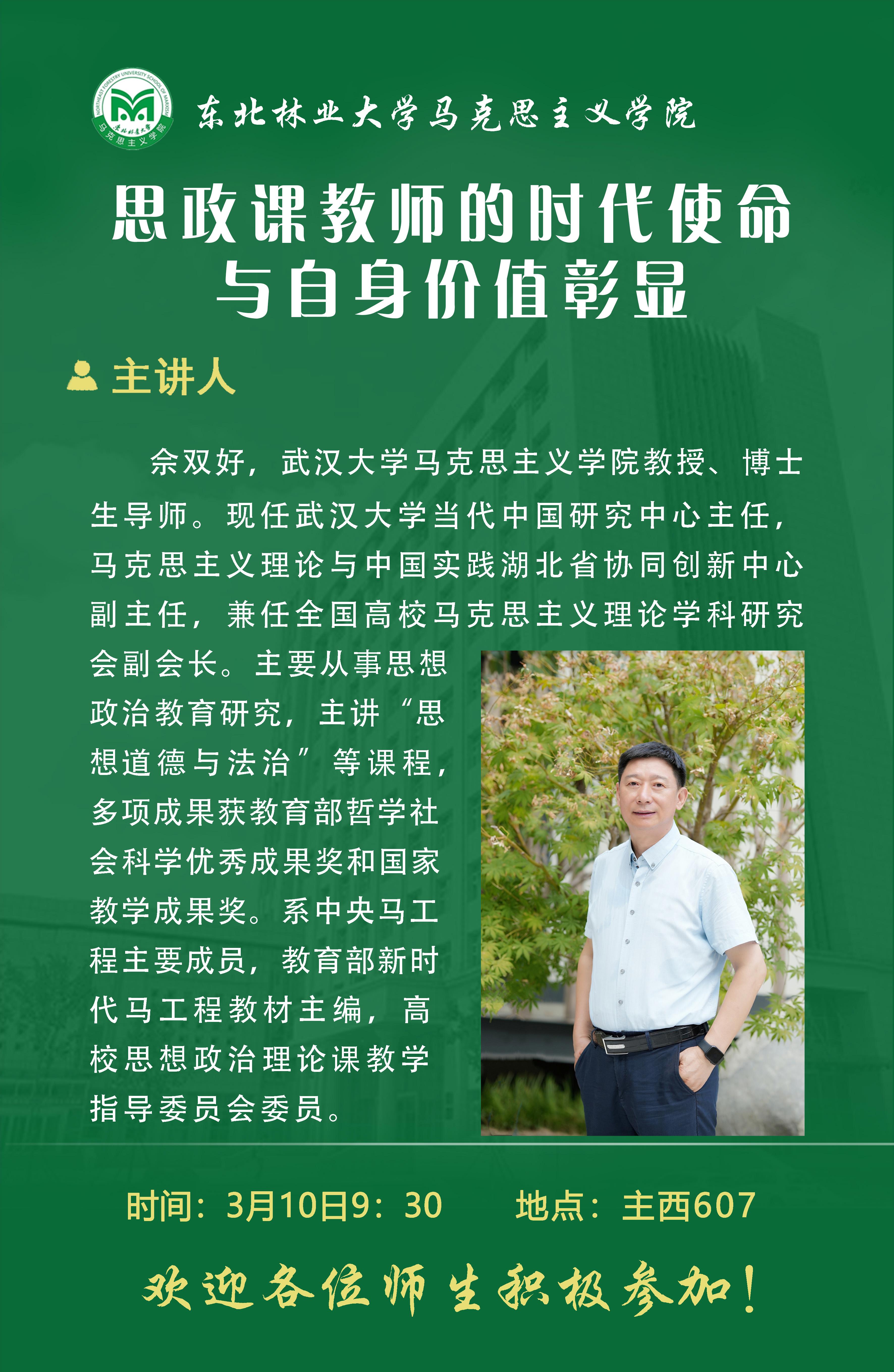 报告人简介:佘双好,武汉大学马克思主义学院教授、博士生导师。现任武汉大学当代中国研究中心主任,马克思主义理论与中国实践湖北省协同创新中心副主任,兼任全国高校马克思主义理论学科研究会副会长。主要从事思想政治教育研究,主讲“思想道德与法治”等课程,多项成果获教育部哲学社会科学优秀成果奖和国家教学成果奖。系中央马工程主要成员,教育部新时代马工程教材主编,高校思想政治理论课教学指导委员会委员。