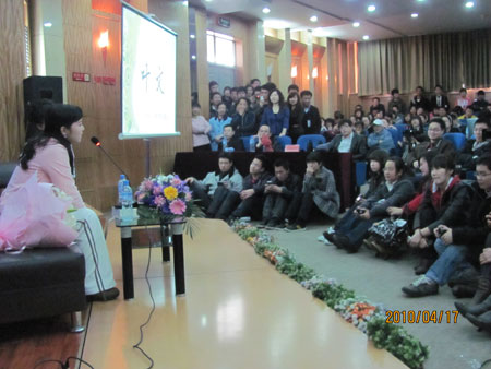 她开场便以邻家大姐的姿态拉近与同学们之间的距离,当被问及学历史专业的她怎么走上主持人岗位时,她“为了工作”的回答赢得了满场笑声,她认为自己是因为机缘巧合,从最初想当历史老师,到担任汉语言教师“不称职”,再到做记者、做主持,没有特殊之处。当谈到她热爱的事业时,她坦言自己也曾“很入戏”,会受到观众的影响,发现这一问题后,她用15天调适自己,积极减压,终于将自己的状态调整为在节目中不失真情流露,在生活中不失丰富多彩。在谈到她如何看待成功时,谦虚的她始终不认为自己是成功的,当然她也认为成功的另一个定义是生活的快乐,这一点上她可能是成功的。