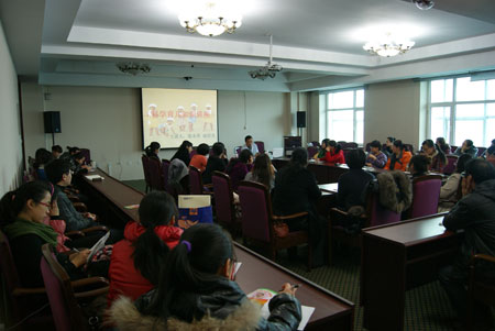 香坊区人口学校校长张本华从婴幼儿应注意的2个系统的疾病、小儿发热、冬季保暖、预防接种、体质增强等10个方面讲解了婴幼儿的日常护理和常见疾病的预防护理知识。香坊区早教中心主任杨崇光,采用多媒体的形式,结合互动的小游戏为宝宝父母们讲解了如何通过游戏培养孩子的专注力。