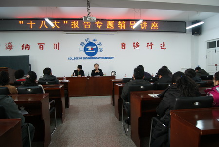 为深入宣传和贯彻落实党的十八大精神,组织动员广大干部师生,把思想和行动统一到党的十八大精神上来,把智慧和力量凝聚到实现党的十八大确定的目标任务上来,2012年12月12日下午2时,工程技术学院党委邀请我校马克思主义学院院长、博士生导师刘经纬教授,为工程技术学院全体教工做十八大精神专题辅导讲座。讲座由工程技术学院党委书记姚永明主持,工程技术学院全体教工共同聆听了本次讲座。