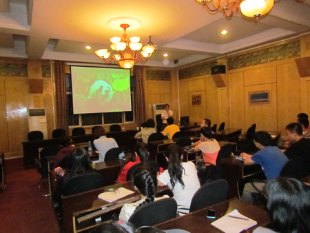 8月28日,中国科学院动物研究所副所长,动物生态与保护生物学重点实验室主任,动物生态与保护遗传学研究组组长,中华人民共和国濒危物种科学委员会副主任、中国动物学会秘书长、兽类学分会副理事长、中国生态学会副理事长,国家林业局第四次大熊猫调查专家委员会主任委员,国家林业局第二次陆生野生动物调查专家委员会主任委员魏辅文老师为我校野生动物资源学院的师生作了大熊猫保护遗传学的讲座。在两个小时的时间内,魏教授就大熊猫偏食竹子的进化过程,历史上竹子开花和狩猎大熊猫、生境破碎化对大熊猫种群的影响,大熊猫气味标记、繁殖产仔等行为学研究,施氏贝蛔虫等疾病对大熊猫健康的影响,大熊猫保护相关的法律法规及规章制度建设,圈养大熊猫野化培训和放归等内容做了精彩纷呈的讲述。