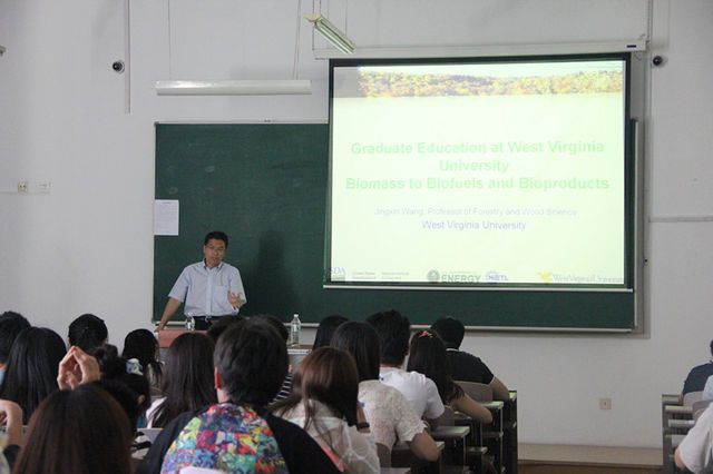 为进一步活跃学术氛围、交流学术思想,应研究生院常务副院长王立海教授之邀,我校杰出校友,现任美国西弗吉尼亚大学木材利用与生物质材料中心主任,美国能源部生物能源首席科学家王景欣教授于2014年6月18日下午14:00为我校师生呈现了一场题为“美国林科研究生教育与美国生物质能源开发及能源政策”(Graduate Education at West Virginia University Biomass to Biofuels and Bioproducts)的精彩报告,会议由研究生院副院长曲发义主持。