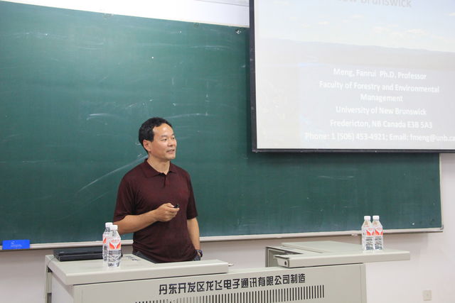 随后,孟教授为同学们讲述了加拿大生态研究的进展和森林经营的情况,介绍了当地的林区分布和地形特点。同时,孟教授也谈到了加拿大森林面对的严峻形势,改革后的采伐原则使加拿大形成了新生态格局,一些森林无法满足生物多样性针的需求,现在面临着稀有群落无法生存的现状。孟教授还利用图表的形式为同学们讲解了土壤养分和水分的对应关系,演示了省份平均光照图和温度分布图,并对如何预测哪个地方的何种树种更适合生长的问题进行了生动形象的解说。