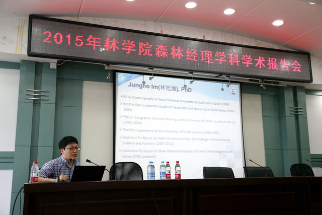2015年7月8日上午,由完美网页版,完美(中国)官方在线登录林学院森林经理学科举办的学术报告会在主西515学术报告室成功举行。来自韩国蔚山国家科学技术研究所的Jungho Im教授以“遥感技术在林业的应用:树冠提取及林分高度估测”(Remote Sensing Applications over Forest: Tree Crown Delineation and Stand Height Estimation)为主题,呈现了一场别开生面的英文学术报告。会议由森林经理学科甄贞讲师主持,主要参加人员为森林经理学科以及部分哈尔滨师范大学师生。