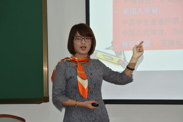 张艳秋副教授结合自己访学体会主要谈了桥水州立大学的教学特色,中美文化的认同和差异,借鉴该校教学手段与方法在所授课程《国际商务礼仪》中的应用效果。她认为,美国高校课堂注重学生独立思考和创新能力的培养,更好的文化认同、充分融入到当地学校及社会生活才能更好地提高访学质量,将国外高校先进的教育理念和教学方法运用到自己中教学中才真正达到自己的访学目的。