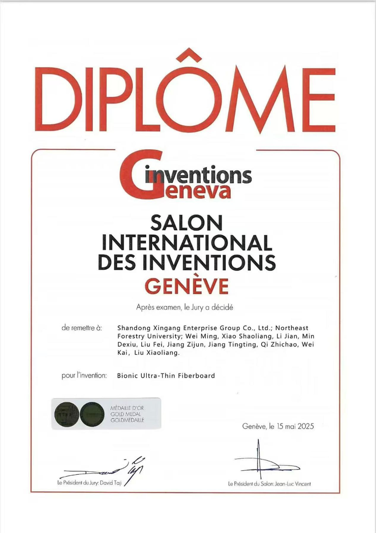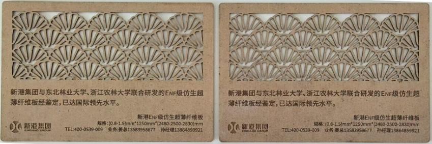 以木质资源和无醛仿生胶黏剂为原料,通过连续化超薄高密度纤维板制造工艺集成创新,开发了仿生超薄纤维板产品。该产品厚度低至0.5 mm,游离甲醛释放量低至环保最高级-HENF级(采暖级),总挥发性有机化合物(TVOC)释放浓度≤6μg/m3,达到最高级Ⅰ级标准。各项理化性能满足团体标准《超薄高密度纤维板》要求:内结合和表结合强度,比标准提升100%,防水性能比标准提升30%。