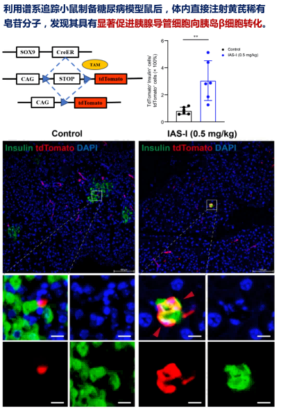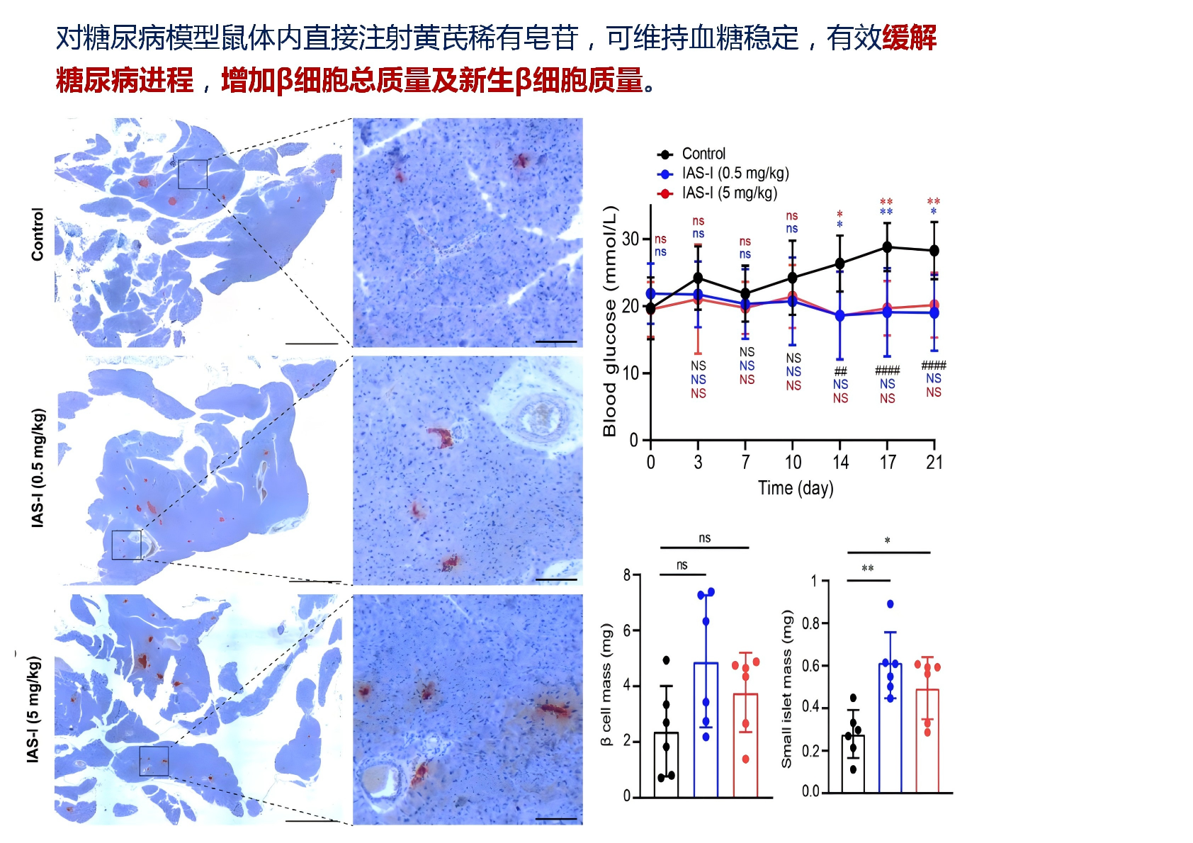 黄芪作为传统中药材,有“补药之长”之称,可扶正补气,在临床治疗糖尿病及其并发症中广泛应用。项目通过对黄芪提取物筛选发现,黄芪稀有皂苷具有促进体外及体内β细胞再生的作用,并探究异黄芪皂苷I体内促β细胞再生的作用机制,促进内源胰腺导管细胞转化为胰岛细胞,为异黄芪皂苷I及其来源中药资源的开发利用奠定研究基础,促进黄芪及其有效成分的临床应用,具有重要的科学意义和潜在应用价值。