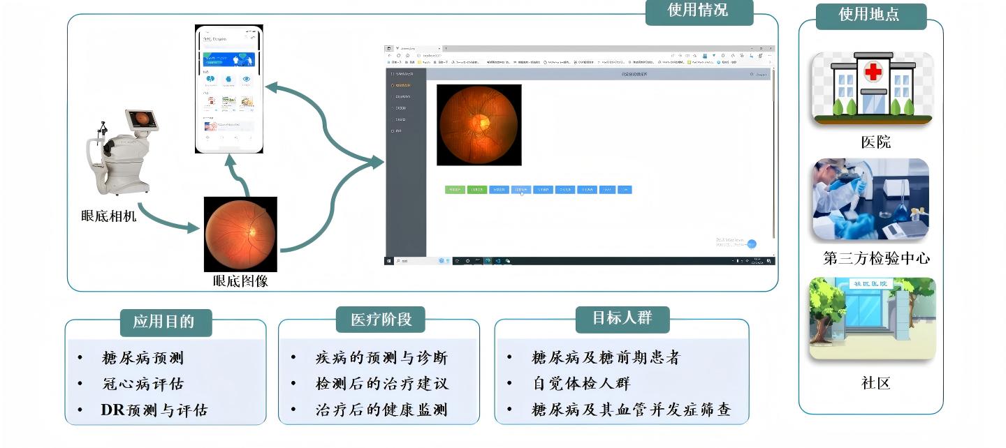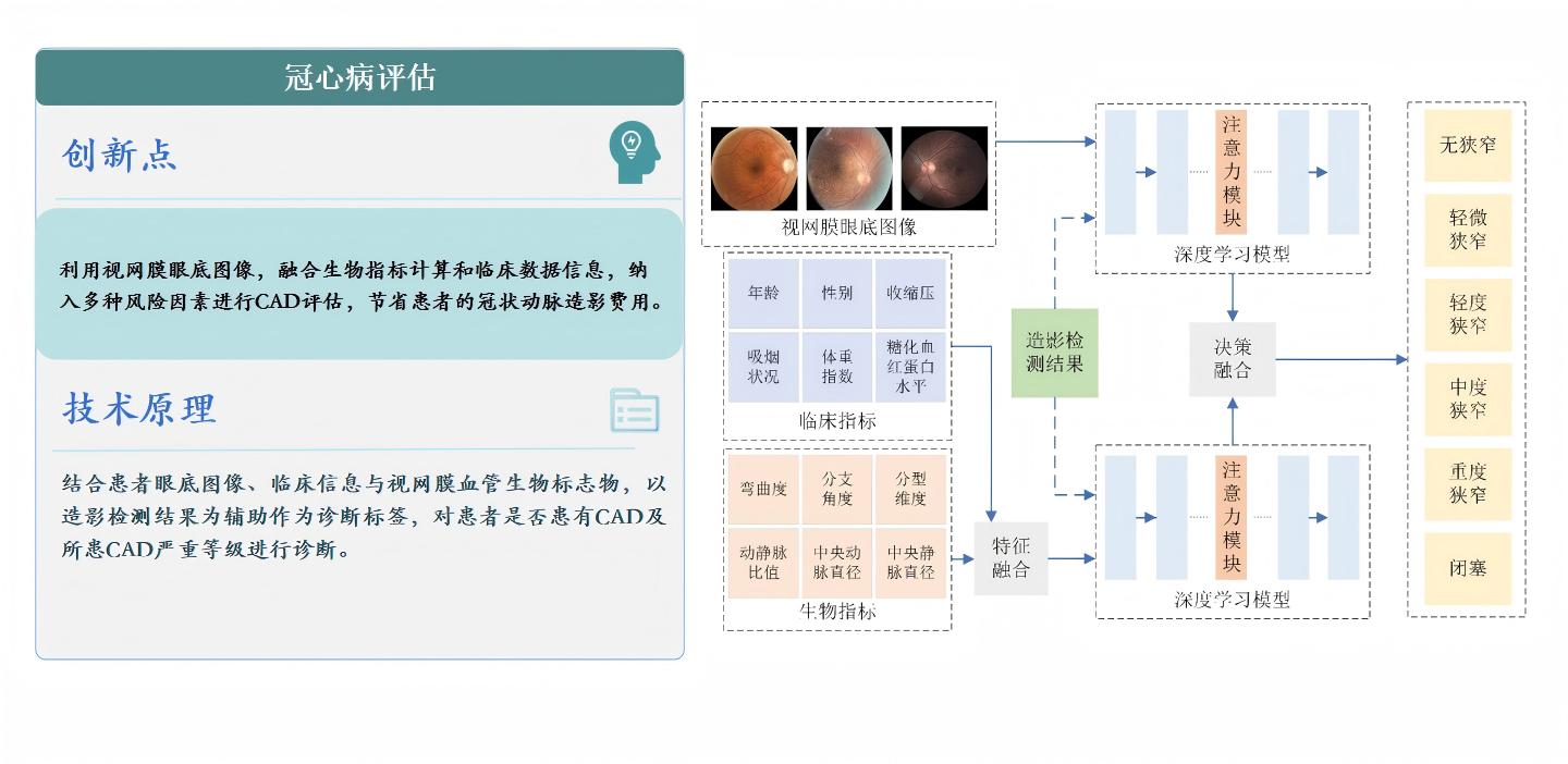 关键技术包括:基于语义分割技术的眼底图像生物指标计算方法、基于特征融合的2型糖尿病风险分层预测方法、基于多任务学习的DR等级评估方法、基于回顾性校正的DR预测方法、基于多模态融合和注意力机制的CAD评估方法、融合先验知识与混沌理论的多用户诊断模型联合迭代方法。